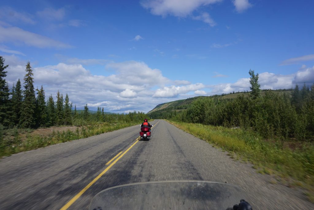 I reached in my pocket to get my wallet to pay for the room. No wallet. I’ll spare the details, but I looked everywhere. It was nowhere to be found. Contrary to common sense and my normal traveling practice, I had everything in one place. Driver’s license, credit card, debit card, cash and passport card. Save the lectures. I know why this was insanely stupid, and I know not to do it. I’ll blame a bit of road fatigue and complacency which had led me to consolidate things into their normal places of the last few days, rather than keep them separated out like they had initially been. As best I can tell, this whole thing happened at the second gas stop. I went to stick my wallet back into a chest pocket on my jacket and missed. Because I’m wearing an airbag vest over the jacket I can’t see that pocket and I just assumed that the wallet went in properly. Again: road fatigue. I suspect that the wallet slid down and sat in my lap while I rode, likely falling unnoticed to the ground when I stood up on the pegs while driving through a gravel stretch. Once on the ground it would be virtually unnoticeable (except maybe as trash). Between the rain and other vehicles, I have no doubt it would be lost forever almost immediately. I reported the loss to the RCMP the next morning (Sunday) and called the local service stations to leave my name and phone number in case it’s turned in. I suspect that it will soon be encased in new asphalt and some archeologist for whatever species supplants humans will discover it a million years from now. Paul loaned me some cash from his stash and will cover my gas until I can make it to a Wells Fargo in Fairbanks on Tuesday. Proving once again that a good riding partner is invaluable. I should note that I had my passport in my saddlebags, so I’m still mobile and have ID.