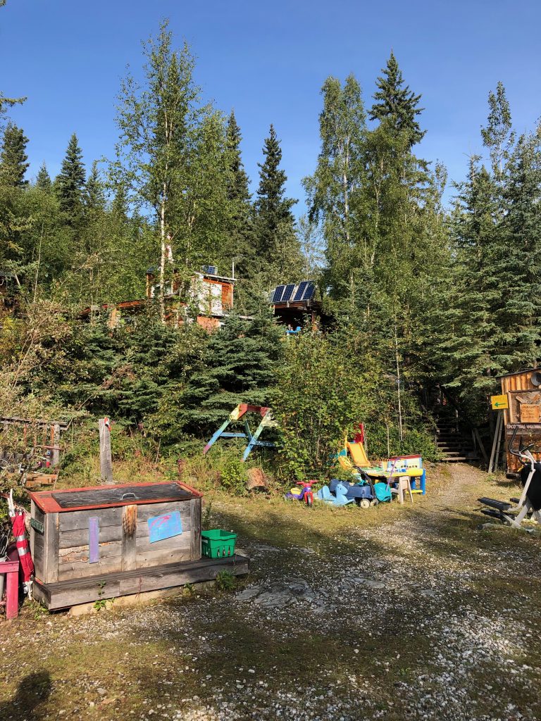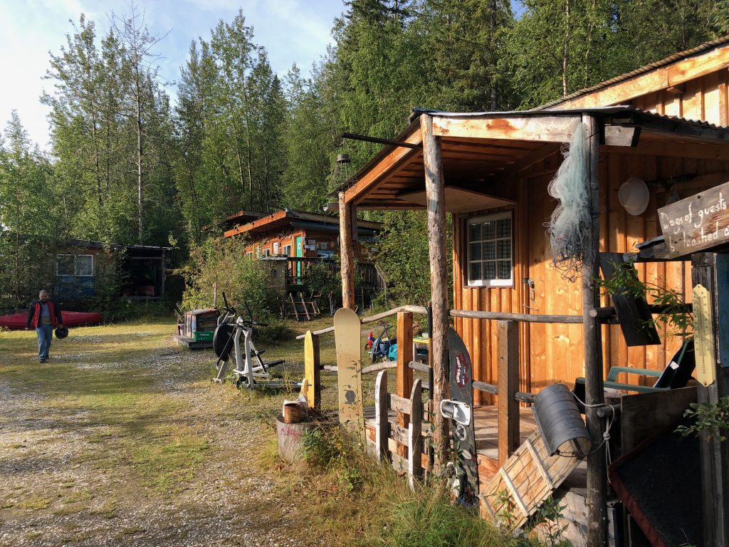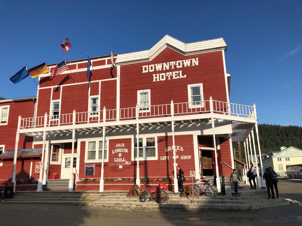About this time, as the rain continued to fall, Kim texted to find out if we’d had any luck. I let her know about the hostel and she headed our way, since the campsite was soggy and gross. By the time she got checked in and her dog settled in her cabin, I had calmed myself down a bit and we were ready to head back across the river to Dawson. The rain abated and a pleasant (but weirdly bright) evening set in.