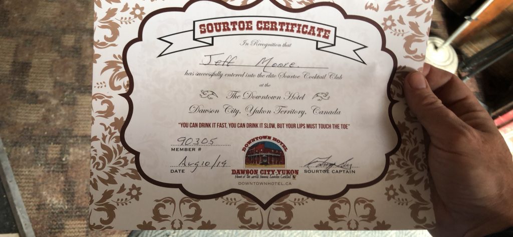 We walked back to the ferry and into town. First stop was the Jack London Saloon, reknowned for its Sourtoe Cocktail. (Note that “sourdough” is local term for a person that lives above the Arctic Circle year ‘round, so the name of the drink is a play on that.) The Sourtoe is not for the faint of stomach or clear of thinking. It’s just a shot of booze with a mummified human toe in it, and it makes the saloon a shit-ton of money. We, like everyone else in the bar, decided that it was just an opportunity for a story that was unlikely to ever come up again. So at 9 o’clock we lined up with about 100 other people and waited our turn for the ‘toe. I went first, then Paul, then Kim. All were successful, if that’s the right word for this particular endeavor. I will say that my mustache acted like a hair force-field, protecting my sensitive skin from the monstrous cargo in my glass. We each got a certificate and our names entered in the Book of the Toe (seriously). When I say it’s a Thing To Do, I mean it. I am person number 90,305 to take part in this stupidity, according to their Book. Would I do it again? Probably not. Am I glad I did it? You bet.