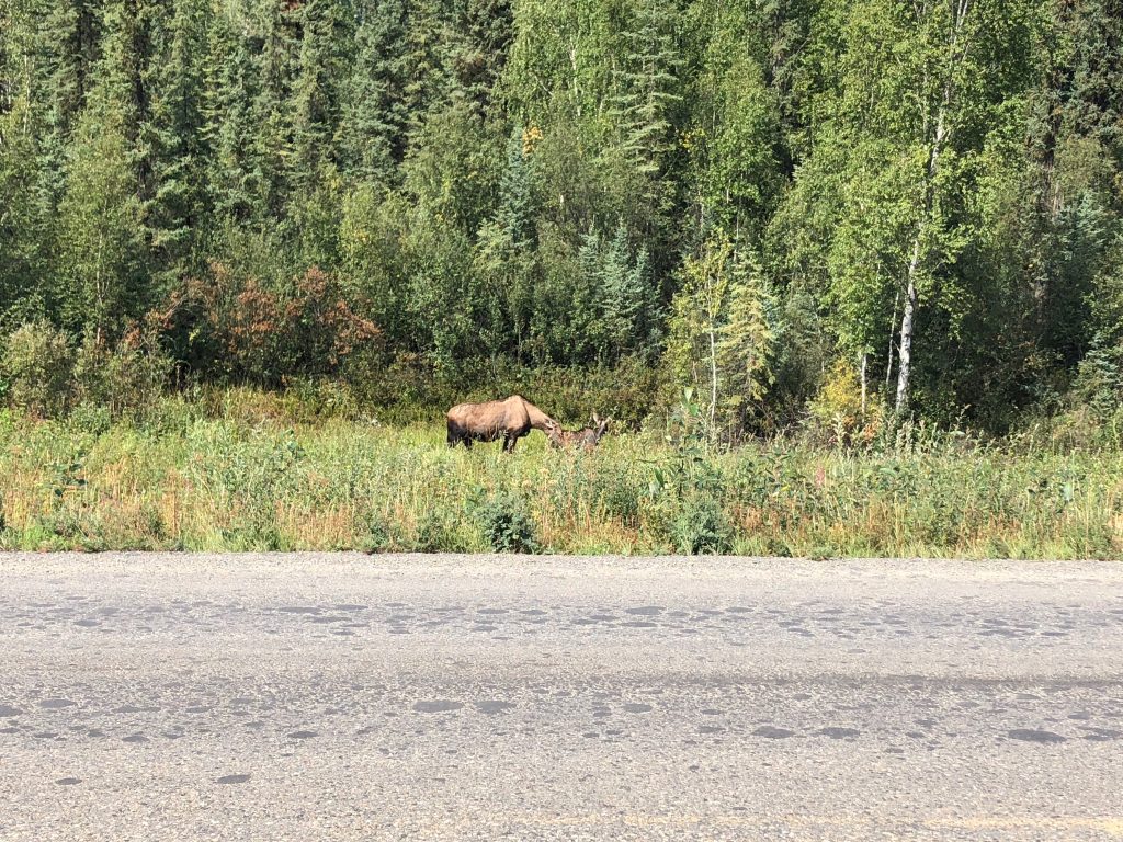 After wandering a bit, we both independently realized that we really just wanted to go for a ride. So we hopped on the bikes and rode about a half hour south to the start of the Dempster, just to check it out. Unsurprisingly, it was just another dirt road heading off into the distance, and we turned around and cruised back into town. We both felt a bit liberated just driving for fun, rather than trying to get to a destination. It would’ve been a relaxing ride for me if I hadn’t been totally unable to stop myself from scanning the side of the road for my damn wallet. No luck. On the other hand, I did spot more mooses! This time it was a Mama Moose and a Baby Moose. And apparently Deadbeat Dad Moose was busy elsewhere. I had Paul circle back around so he could see the moosies, but he didn’t understand what was going on and began to scan the horizon for possible locations from his parent’s painting. The meese took the opportunity and slid back into the forest. Paul was, again, unsuccessful, but I scored yet another picture of the Eloosive Moose.