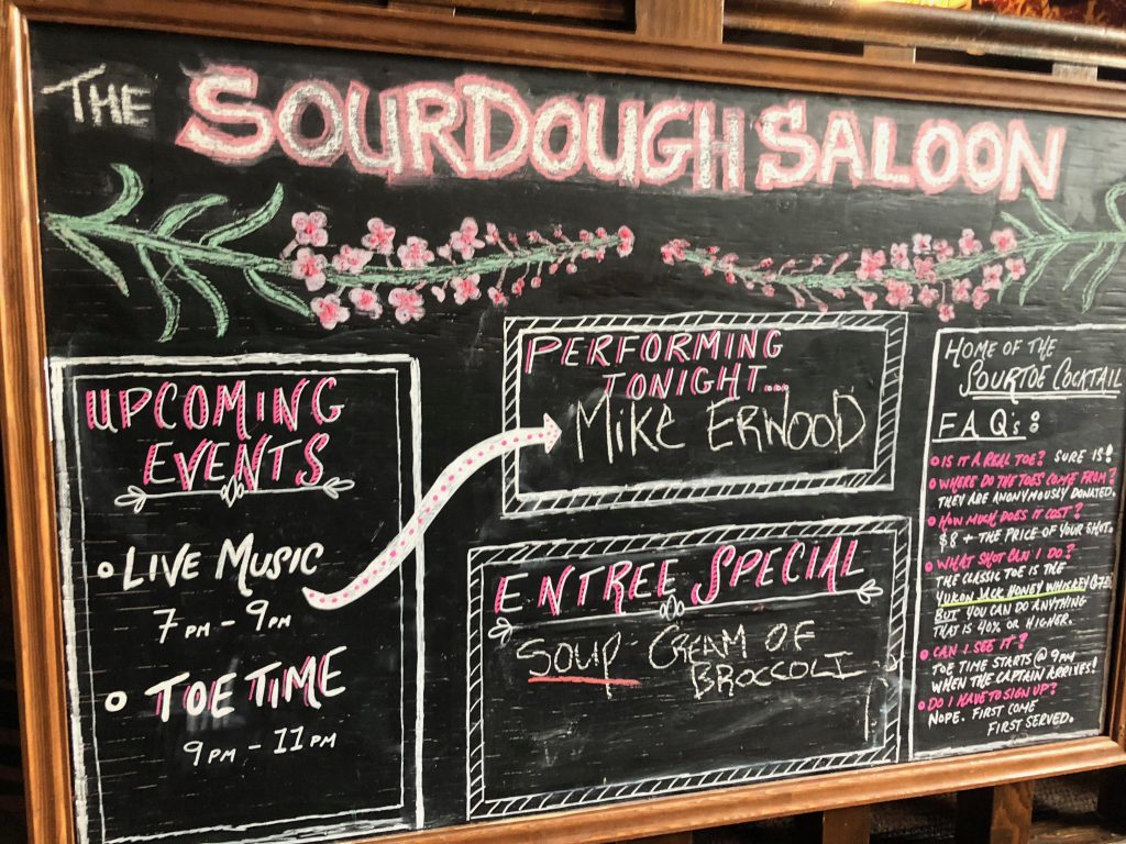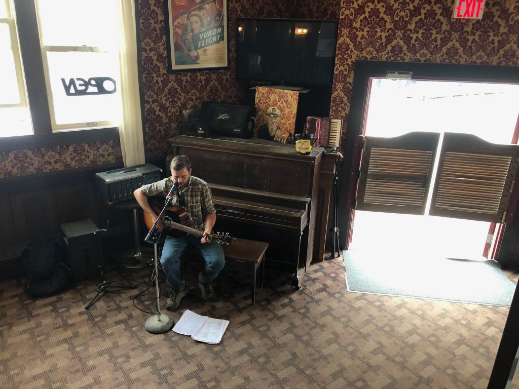 After a bit of recuperation, we wandered out for dinner. But first, beer! Back to the home of the Sourtoe, where it was quieter because it wasn’t yet “Toe Time”. This time, though, the quiet was an unfortunate thing. You see, the Klondike’s Worst Singer had taken up residence and, sadly, we could hear him over the din of the crowd. It was…so bad. Soooo bad. I kind of wish I had a recording of him, but I love you all too much to subject you to that. Here’s a picture.