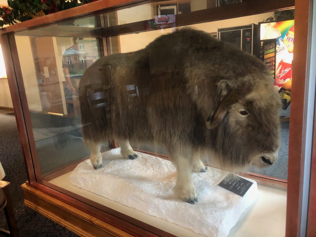 Breakfast was interesting, if only for the scenery. The food was tasty, mind you, but I kept getting distracted by the GIANT STUFFED MUSK OX in a box just over Paul’s shoulder. Let me show you: