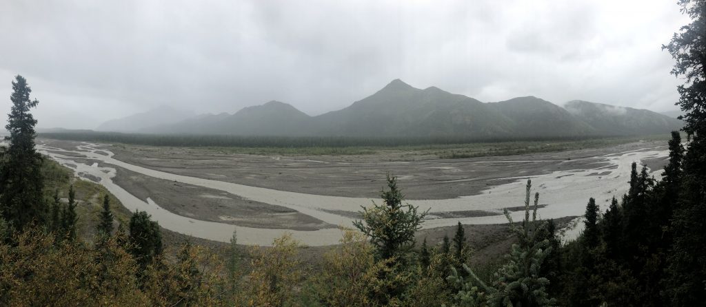 An aside about the weather is in order. On the way down to Denali, it was sprinkling but mostly dry. Paul opted to wear his dry weather gear, accordingly. There was initially some confusion about whether the predicted rain had actually come to Fairbanks, calling into question our snap decision to drive to Denali fairly late into the night at the end of a long day. We later met a woman in the park who had driven down to the park from Fairbanks that morning. She assured us that the skies had opened up last night, and in fact it was still pouring this morning. She said that the drive down in her rented truck was a bit hairy. We hadn’t regretted the decision to come down in any case, but the news certainly prompted a new round of self back-patting.