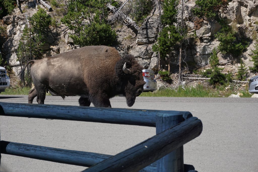 Got a bit of a late start as we sorted a sensor issue on Paul’s bike. We skipped breakfast in the interest of time and headed straight to the Grand Canyon of the Yellowstone. On the way…Bison Attack! Clearly not satisfied with their loss yesterday, the Bison hid by the side of the road and leapt out as we approached. But we were ready for them. Paul bravely dodged to the far side of a car and tried to look like a fender. I courageously turned around and hid behind a fence. But this time I took pictures!