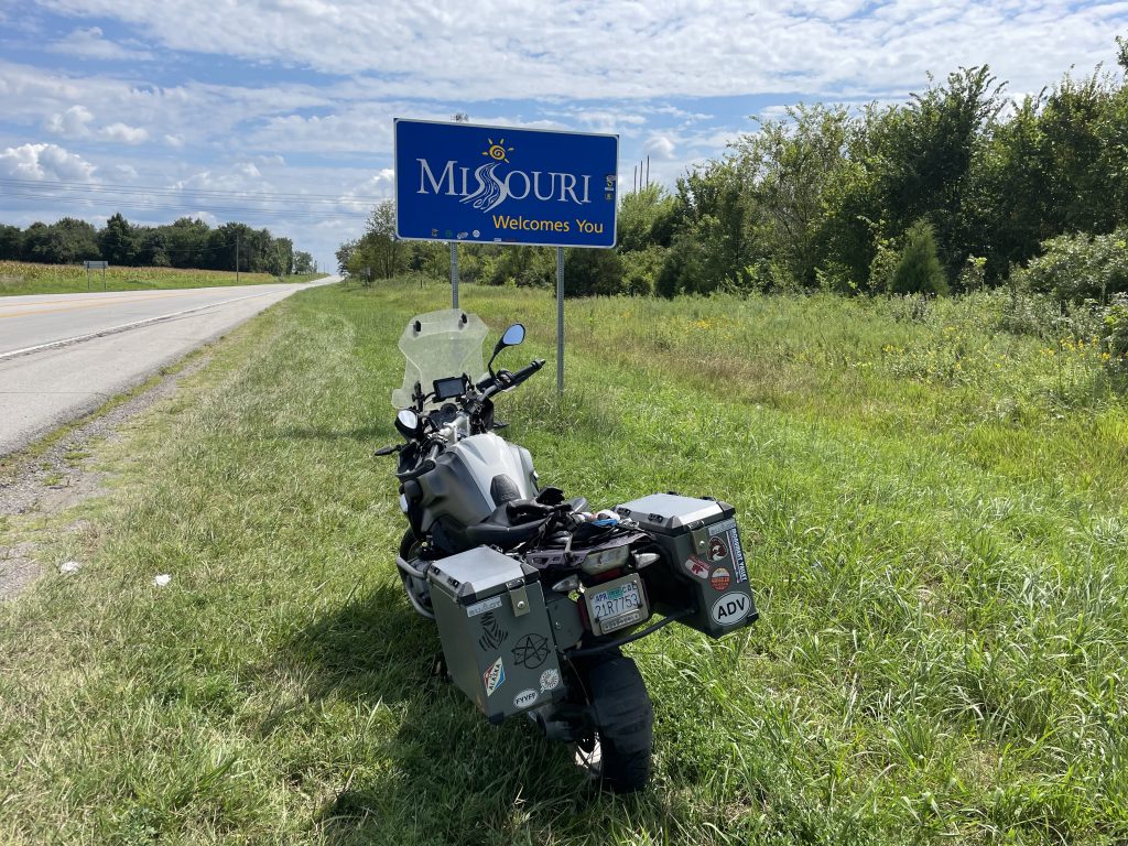 After that it was just straight driving to the Missouri border. The plains turned into a more hilly, forested, interesting land as I moved east. I kept waiting for a noticeable border feature, but Nope! Boom, bitch! Missouri up in your grill. The sign came up so fast and I had traffic on my ass to boot…I almost dumped the bike as I moved into this grass verge. I think the lady behind me peed her pants as she saw me skidding towards the sign. I’m positive that wasn’t my urine trail stretching down the road…
